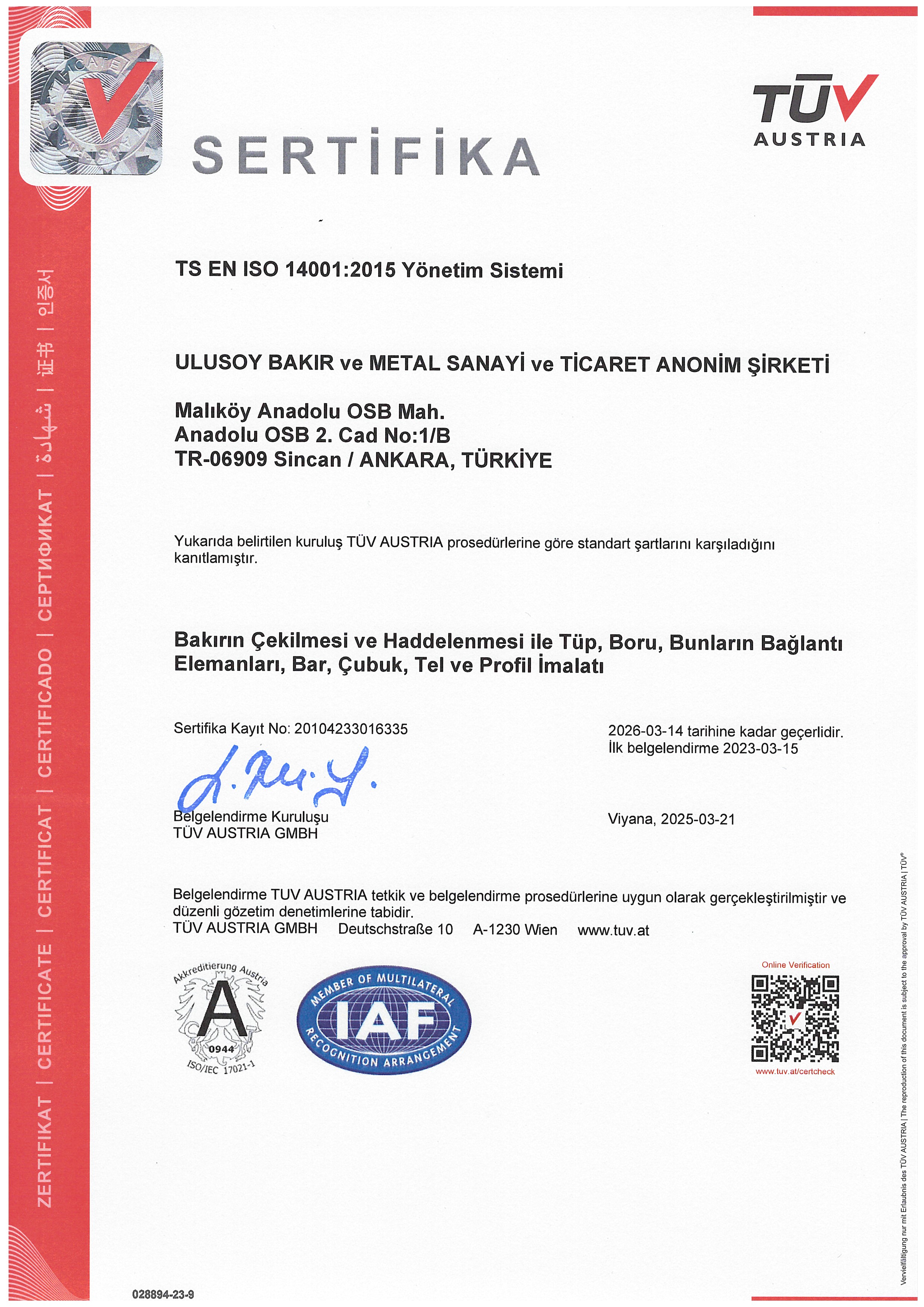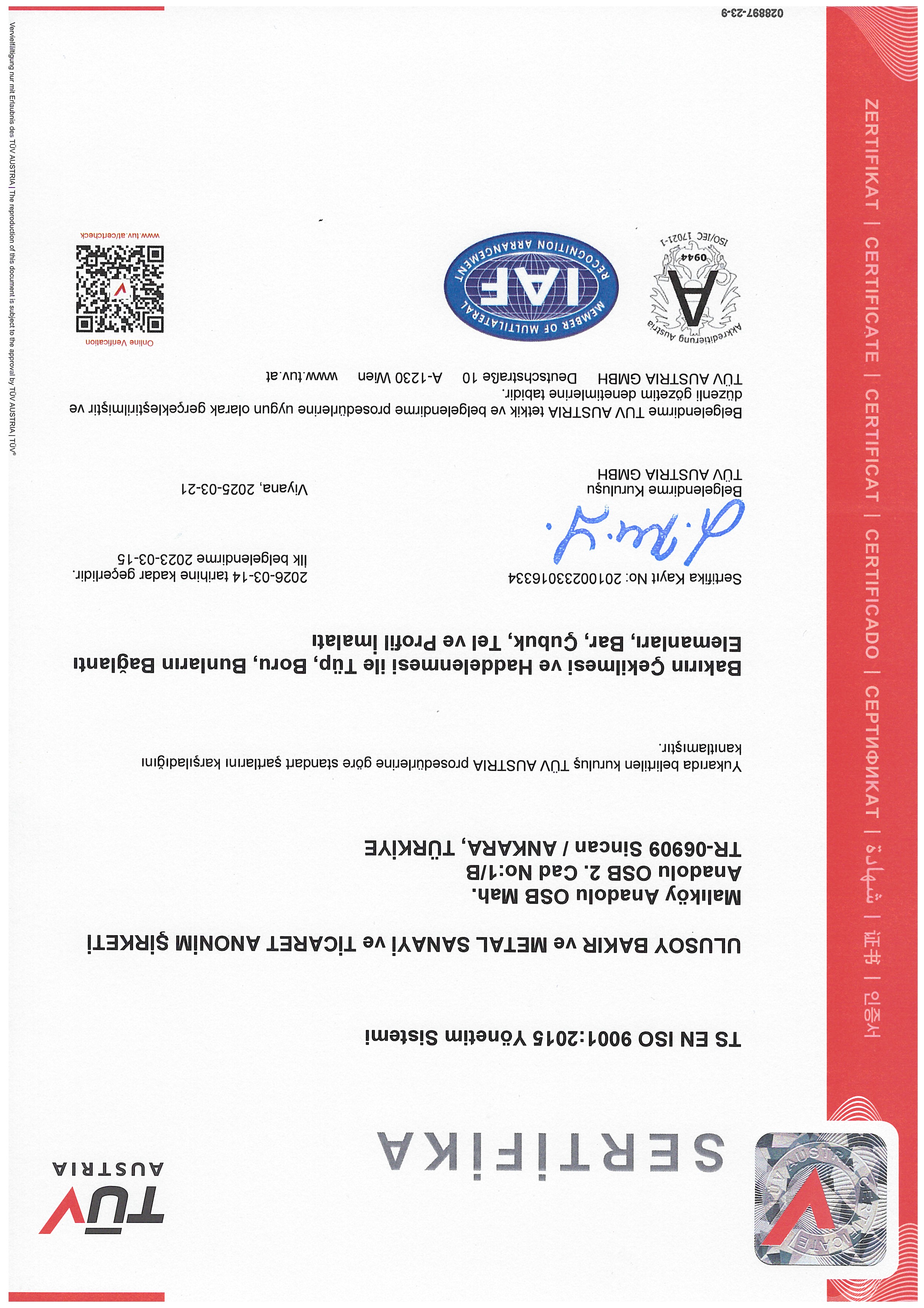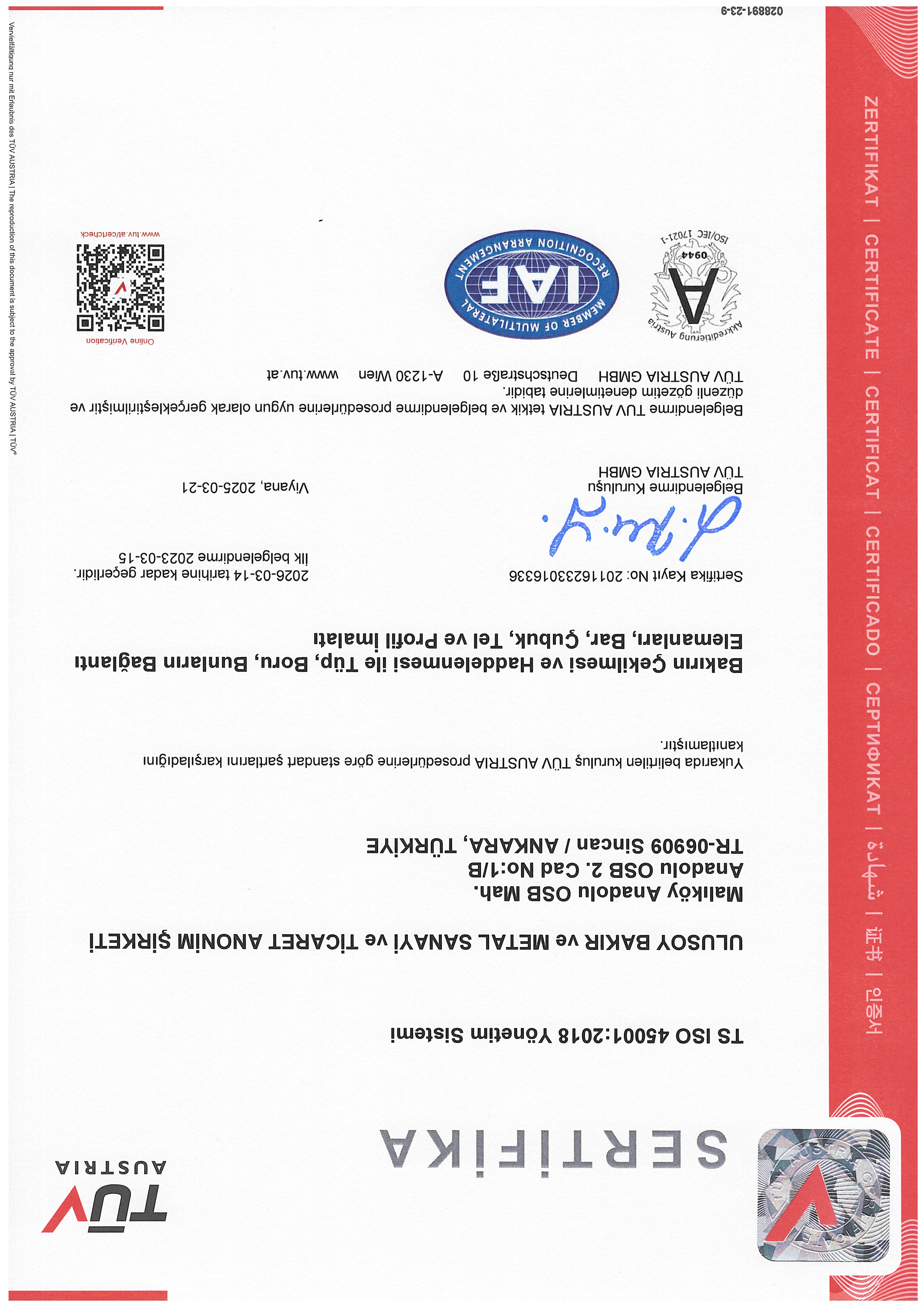Bütüncül kalite konusunda gerçekleştirilen hassas çalışmalar Tüv Avusturya tarafından denetlenmiş ve ISO9001, ISO14001 ve ISO45001 kalite yönetim sistemleri ile belgelendirilmiştir.